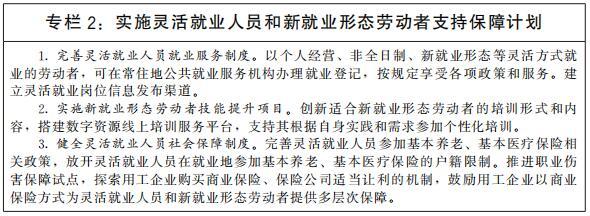 支持多渠道靈活就業(yè)和新就業(yè)形態(tài)發(fā)展。破除各種不合理限制,建立促進多渠道靈活就業(yè)機制,支持和規(guī)范發(fā)展新就業(yè)形態(tài)。鼓勵傳統(tǒng)行業(yè)跨界融合、業(yè)態(tài)創(chuàng)新,增加靈活就業(yè)和新就業(yè)形態(tài)就業(yè)機會。加快落實《關(guān)于維護新就業(yè)形態(tài)勞動者勞動保障權(quán)益的指導意見》,建立完善適應靈活就業(yè)和新就業(yè)形態(tài)的勞動權(quán)益保障制度,引導支持靈活就業(yè)人員和新就業(yè)形態(tài)勞動者參加社會保險,提高靈活就業(yè)人員和新就業(yè)形態(tài)勞動者社會保障水平。規(guī)范平臺企業(yè)用工,明確平臺企業(yè)勞動保護責任。健全職業(yè)分類動態(tài)調(diào)整機制,持續(xù)開發(fā)新職業(yè),發(fā)布新職業(yè)標準。
