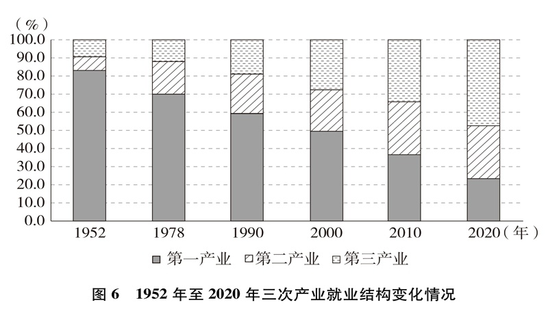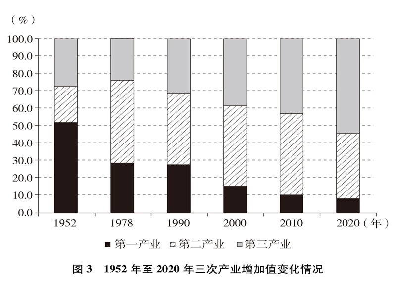 產(chǎn)業(yè)結(jié)構(gòu)優(yōu)化升級。中國已建成世界上最完整的產(chǎn)業(yè)體系,產(chǎn)業(yè)發(fā)展持續(xù)向中高端邁進(jìn)。三次產(chǎn)業(yè)增加值之比從1952年的50.5∶20.8∶28.7到2020年的7.7∶37.8∶54.5,中國從傳統(tǒng)農(nóng)業(yè)大國成為工業(yè)大國、服務(wù)業(yè)大國(圖3),中國經(jīng)濟(jì)從依賴單一產(chǎn)業(yè)為主轉(zhuǎn)向依靠三次產(chǎn)業(yè)共同帶動。農(nóng)業(yè)現(xiàn)代化成效顯著,機(jī)械化、數(shù)字化、綠色化、功能化、共享化水平明顯提高,廣大農(nóng)民逐步告別“面朝黃土背朝天、一身力氣百身汗”的辛勞,農(nóng)村生產(chǎn)力極大解放;糧食生產(chǎn)能力穩(wěn)步提升,實現(xiàn)谷物基本自給,中國人把飯碗牢牢端在自己手中。中國建成門類齊全、獨(dú)立完整的現(xiàn)代工業(yè)體系,工業(yè)化和信息化融合發(fā)展的廣度和深度不斷拓展,“中國制造”向“中國智造”轉(zhuǎn)型升級,產(chǎn)業(yè)鏈供應(yīng)鏈現(xiàn)代化水平進(jìn)一步提升。以新一代信息技術(shù)、生物技術(shù)、高端裝備、綠色環(huán)保為代表的戰(zhàn)略性新興產(chǎn)業(yè)發(fā)展迅速,成為引領(lǐng)高質(zhì)量發(fā)展的重要引擎。數(shù)字經(jīng)濟(jì)激發(fā)經(jīng)濟(jì)發(fā)展新活力,產(chǎn)業(yè)數(shù)字化和數(shù)字產(chǎn)業(yè)化趨勢加快?,F(xiàn)代服務(wù)業(yè)加速發(fā)展,以“互聯(lián)網(wǎng)+”為標(biāo)志的新業(yè)態(tài)、新模式層出不窮,平臺經(jīng)濟(jì)、共享經(jīng)濟(jì)蓬勃興起,生產(chǎn)性服務(wù)業(yè)向?qū)I(yè)化和高端化發(fā)展,生活性服務(wù)業(yè)向精細(xì)化和高品質(zhì)轉(zhuǎn)變。產(chǎn)業(yè)結(jié)構(gòu)的優(yōu)化升級促進(jìn)了經(jīng)濟(jì)更加均衡、更加充分的發(fā)展,人們個性化品質(zhì)化多樣化需求不斷得到滿足。