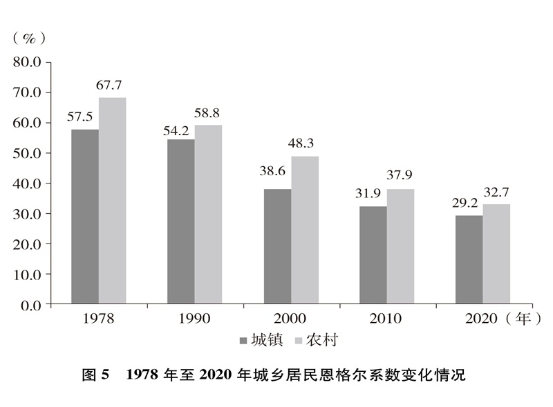 人民生活水平顯著提高。居民收入持續(xù)增加,全國居民人均年可支配收入從1978年的171元增加到2020年的32189元(圖4)。城鄉(xiāng)居民恩格爾系數(shù)分別從1978年的57.5%、67.7%下降到2020年的29.2%、32.7%(圖5),城鄉(xiāng)居民生活質(zhì)量不斷提升。溫飽問題解決后,人們對生活品質(zhì)、品位有了更高的追求,衣食住行不斷升級,消費(fèi)結(jié)構(gòu)從生存型逐漸向發(fā)展型、享受型過渡。衣,從穿暖到穿美、穿出時尚;食,從吃飽到吃好、吃出健康;住,從有所居到更敞亮、更宜居;行,從便利通暢到快捷舒適。吃穿用有余,家電全面普及,乘用汽車快速進(jìn)入尋常百姓家。餐飲、健康、教育、旅游、文娛等服務(wù)性消費(fèi)持續(xù)快速增長,在居民人均消費(fèi)支出中占比逐漸達(dá)到一半左右。越來越多的人有“錢”有“閑”,“詩和遠(yuǎn)方”更加觸手可及,“說走就走”不再是夢想,旅游扮靚人們的幸福生活,中國正在進(jìn)入大眾旅游時代。