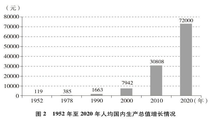 經(jīng)濟(jì)實力大幅提升。中國國內(nèi)生產(chǎn)總值從1952年的679.1億元躍升至2020年的101.6萬億元,經(jīng)濟(jì)總量占全球經(jīng)濟(jì)比重超過17%,穩(wěn)居世界第二大經(jīng)濟(jì)體(圖1)。人均國內(nèi)生產(chǎn)總值從1952年的幾十美元增至2020年的超過1萬美元,實現(xiàn)從低收入國家到中等偏上收入國家的歷史性跨越(圖2)。制造業(yè)增加值多年位居世界首位,220多種工業(yè)產(chǎn)品產(chǎn)量居世界第一,自2010年起連續(xù)11年位居世界第一制造業(yè)大國。中國已是全球貨物貿(mào)易第一大國、服務(wù)貿(mào)易第二大國、商品消費(fèi)第二大國、外匯儲備第一大國,2020年利用外資居全球第一。不斷邁向共同富裕的14億多人口,其中有超過4億并不斷擴(kuò)大的中等收入群體,是全球最具成長性的超大規(guī)模市場,中國經(jīng)濟(jì)充滿活力,具有巨大潛力和充足后勁。2020年,中國率先控制新冠肺炎疫情,率先復(fù)工復(fù)產(chǎn),率先實現(xiàn)經(jīng)濟(jì)增長由負(fù)轉(zhuǎn)正,充分彰顯中國經(jīng)濟(jì)的強(qiáng)勁韌性。