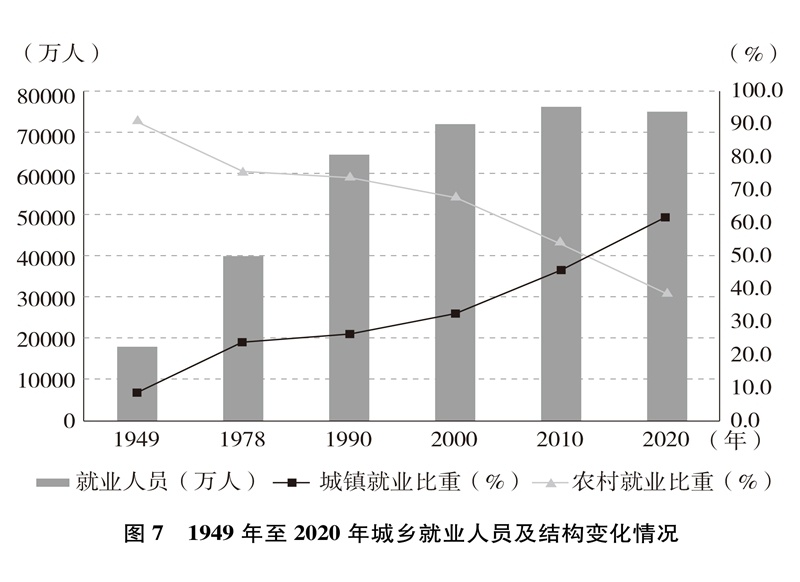 就業(yè)局勢長期穩(wěn)定,就業(yè)質(zhì)量顯著提升。就業(yè)人數(shù)從1949年的1.8億增加到2020年的7.5億,就業(yè)規(guī)模不斷擴(kuò)大;從絕大多數(shù)勞動者以農(nóng)業(yè)為生到第三產(chǎn)業(yè)就業(yè)人數(shù)占47.7%(圖6)、城鎮(zhèn)就業(yè)人數(shù)占61.6%(圖7),就業(yè)結(jié)構(gòu)不斷優(yōu)化;從勞動者普遍處于文盲半文盲狀態(tài)到勞動年齡人口平均受教育年限10.8年、技能人才總量約2億,就業(yè)人員素質(zhì)大幅提高。億萬勞動者擁有自己熱愛的工作,開啟幸福生活的大門。從計劃分配到市場就業(yè)、自由擇業(yè)、自主創(chuàng)業(yè),從傳統(tǒng)就業(yè)方式到新就業(yè)形態(tài),勞動者的就業(yè)觀念深刻變革、就業(yè)空間更加廣闊、就業(yè)方式日益多元。人們的興趣愛好、特長稟賦與個人就業(yè)意愿、社會需求、國家需要更好結(jié)合,自我價值更好實現(xiàn),主動性創(chuàng)造性顯著增強(qiáng),創(chuàng)新創(chuàng)造熱情不斷迸發(fā)。勞動者合法權(quán)益得到保障,勞動報酬保持增長,勞動所得受到保護(hù),人們越來越有尊嚴(yán)地勞動、快樂地勞動,依靠自己的雙手創(chuàng)造美好生活。從“單休制”到“雙休制”,從“黃金周”到帶薪年休假,勞動者休息休假權(quán)益越來越有保障,工作生活更加平衡。勞動最光榮、最崇高、最偉大、最美麗日益成為全社會的共識和行動,勤奮做事、勤勉為人、勤勞致富成為風(fēng)尚,崇尚勞動、尊重勞動、熱愛勞動的社會氛圍更加濃厚。