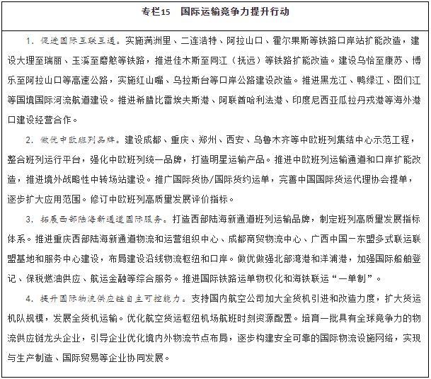 著力形成陸??战y(tǒng)籌的運(yùn)輸網(wǎng)絡(luò),加強(qiáng)供需對接和運(yùn)力協(xié)調(diào),提升國家物流供應(yīng)鏈保障能力。務(wù)實(shí)推動與東盟國家及重要海運(yùn)通道沿線國家的合作,加強(qiáng)海事國際合作,與海上絲綢之路沿線國家合作推進(jìn)海外港口建設(shè)經(jīng)營,建設(shè)現(xiàn)代化遠(yuǎn)洋運(yùn)輸船隊,維護(hù)國際海運(yùn)重要通道安全暢通。增強(qiáng)國際航空貨運(yùn)能力,提高航權(quán)、時刻等關(guān)鍵資源配置效率,支持航空公司構(gòu)建國際貨運(yùn)航線網(wǎng)絡(luò),打造具有全球競爭力的航空物流企業(yè),提升航空物流全球響應(yīng)能力。培育壯大具有國際競爭力的物流企業(yè),穩(wěn)步推進(jìn)建設(shè)海外分撥中心和末端寄遞配送網(wǎng)絡(luò)。提升國際物流供應(yīng)鏈信息服務(wù)水平,做好與外貿(mào)企業(yè)的物流信息對接。
