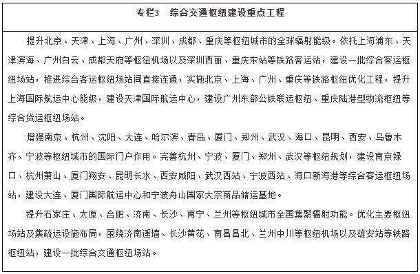 建設(shè)多節(jié)點(diǎn)、網(wǎng)格狀、全覆蓋的京津冀一體化綜合交通網(wǎng)絡(luò),基本建成軌道上的京津冀,高標(biāo)準(zhǔn)、高質(zhì)量打造雄安新區(qū)對外交通網(wǎng)絡(luò),加強(qiáng)北京城市副中心與中心城區(qū)、廊坊北三縣交通基礎(chǔ)設(shè)施互聯(lián)互通,強(qiáng)化北京冬奧會、冬殘奧會交通保障。依托長江黃金水道,整體設(shè)計推進(jìn)長江經(jīng)濟(jì)帶綜合交通運(yùn)輸體系建設(shè),補(bǔ)強(qiáng)沿江高鐵和鐵路貨運(yùn)能力,全力打通公路省際待貫通路段,提升江海聯(lián)運(yùn)、鐵水聯(lián)運(yùn)發(fā)展水平。推進(jìn)粵港澳大灣區(qū)基礎(chǔ)設(shè)施互聯(lián)互通,優(yōu)化航運(yùn)和航空資源配置,加強(qiáng)港澳與內(nèi)地的交通聯(lián)系,支持香港提升國際航運(yùn)、國際航空樞紐地位。推動長三角地區(qū)交通運(yùn)輸更高質(zhì)量一體化發(fā)展,加快對外交通、城際交通、都市圈交通高效銜接和有機(jī)融合,協(xié)同推進(jìn)港航、海事一體化發(fā)展,推動上海市、江蘇省、浙江省、安徽省共建輻射全球的航運(yùn)樞紐,加快提升江蘇通州灣江海聯(lián)動示范區(qū)功能,打造長江集裝箱運(yùn)輸新出海口。構(gòu)建海南島內(nèi)暢通、陸島連通、全球通達(dá)的現(xiàn)代綜合交通運(yùn)輸體系,建設(shè)現(xiàn)代化綜合交通樞紐,穩(wěn)步推進(jìn)自由貿(mào)易港建設(shè)。構(gòu)建黃河流域綠色安全便捷綜合交通網(wǎng)絡(luò),強(qiáng)化跨區(qū)域大通道建設(shè)。