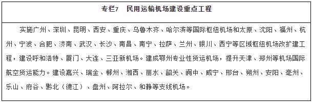 擴(kuò)大航空網(wǎng)絡(luò)覆蓋。推動區(qū)域機(jī)場群協(xié)同發(fā)展,建設(shè)京津冀、長三角、粵港澳大灣區(qū)、成渝等世界級機(jī)場群。適時啟動能力緊張樞紐機(jī)場改擴(kuò)建工程,強(qiáng)化樞紐機(jī)場綜合保障能力。合理加密機(jī)場布局,穩(wěn)步建設(shè)支線機(jī)場和專業(yè)性貨運(yùn)樞紐機(jī)場,提升綜合性機(jī)場貨運(yùn)能力和利用率。有序推進(jìn)通用機(jī)場規(guī)劃建設(shè),構(gòu)建區(qū)域短途運(yùn)輸網(wǎng)絡(luò),探索通用航空與低空旅游、應(yīng)急救援、醫(yī)療救護(hù)、警務(wù)航空等融合發(fā)展。優(yōu)化航路航線網(wǎng)絡(luò),加強(qiáng)軍民航空管基礎(chǔ)設(shè)施建設(shè),推廣應(yīng)用空管新技術(shù)。