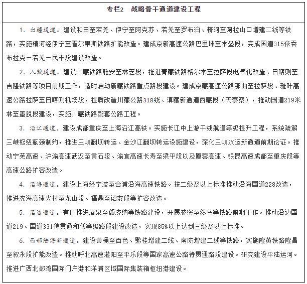 加強(qiáng)戰(zhàn)略骨干通道建設(shè)。推進(jìn)出疆入藏通道建設(shè),擴(kuò)大甘新、青新、青藏、川藏四條內(nèi)聯(lián)主通道通行能力,穩(wěn)步推進(jìn)川藏鐵路建設(shè),加快推進(jìn)新藏鐵路和田至日喀則段前期工作、適時啟動重點(diǎn)路段建設(shè),有序推進(jìn)滇藏鐵路前期工作,密實(shí)優(yōu)化航空航線網(wǎng)絡(luò)布局,構(gòu)建多向聯(lián)通的通道布局。暢通沿江通道,加快建設(shè)沿江高鐵,優(yōu)化以高等級航道和干線鐵路、高速公路為骨干的沿江綜合運(yùn)輸大通道功能。升級沿海通道,提高鐵路通道能力,推進(jìn)高速公路繁忙路段擴(kuò)容改造,提升港口航道整體效能,構(gòu)建大容量、高品質(zhì)的運(yùn)輸走廊。貫通沿邊通道,提級改造普通國省干線,推進(jìn)重點(diǎn)方向沿邊鐵路建設(shè),提高安全保障水平。建設(shè)西部陸海新通道,發(fā)揮鐵路在陸路運(yùn)輸中的骨干作用和港口在海上運(yùn)輸中的門戶作用,強(qiáng)化東、中、西三條通路,形成大能力主通道,銜接國際運(yùn)輸通道。