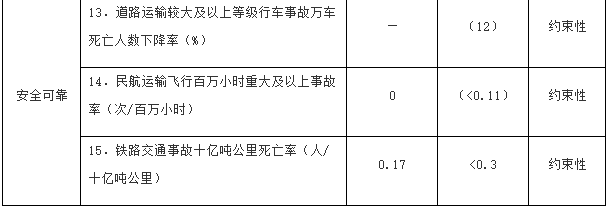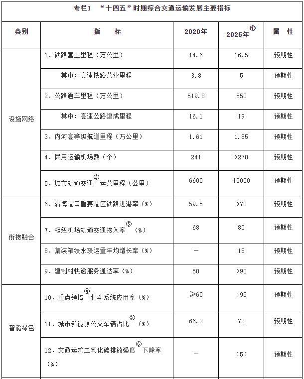 注:①〔〕內(nèi)為5年累計數(shù)。②指納入國家批準(zhǔn)的城市軌道交通建設(shè)規(guī)劃中的大中運(yùn)量城市軌道交通項(xiàng)目。③指國際樞紐機(jī)場和區(qū)域樞紐機(jī)場中連通軌道交通的機(jī)場數(shù)量占比。④指重點(diǎn)營運(yùn)車輛、郵政快遞自有干線運(yùn)輸車輛、應(yīng)安裝具備衛(wèi)星定位功能船載設(shè)備的客船及危險品船等。⑤指新能源公交車輛占所有地面公交車輛的比重。⑥指按單位運(yùn)輸周轉(zhuǎn)量計算的二氧化碳排放。