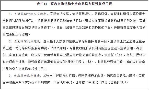 健全綜合交通運(yùn)輸應(yīng)急管理體制機(jī)制,完善應(yīng)急協(xié)調(diào)機(jī)制和應(yīng)急預(yù)案體系,加強(qiáng)交通運(yùn)輸調(diào)度與應(yīng)急指揮平臺建設(shè)。推進(jìn)區(qū)域性公路應(yīng)急裝備物資儲備中心建設(shè)。加強(qiáng)水上交通安全監(jiān)管、航海保障和救助打撈能力建設(shè),完善沿海和內(nèi)河溢油應(yīng)急設(shè)備庫,構(gòu)建陸??仗煲惑w化水上交通運(yùn)輸安全保障體系。建設(shè)城市軌道交通應(yīng)急演練中心。以骨干航空物流企業(yè)為主體構(gòu)建航空應(yīng)急服務(wù)網(wǎng)絡(luò)。建設(shè)海事監(jiān)管指揮系統(tǒng)。在開展城市交通基礎(chǔ)設(shè)施地下空間、低洼區(qū)域、重點(diǎn)區(qū)段、重要點(diǎn)位、關(guān)鍵設(shè)施等隱患排查基礎(chǔ)上,建立健全風(fēng)險臺賬和災(zāi)害隱患清單,補(bǔ)齊設(shè)施設(shè)備、應(yīng)急搶險物資等短板,持續(xù)完善應(yīng)急處置預(yù)案,健全應(yīng)急響應(yīng)機(jī)制,提升應(yīng)對極端天氣能力。加強(qiáng)應(yīng)急專業(yè)隊伍和志愿者隊伍建設(shè),充實(shí)國家應(yīng)急運(yùn)輸儲備力量。健全應(yīng)對重大疫情、防范應(yīng)對恐怖襲擊、保障信息安全等非傳統(tǒng)安全應(yīng)急指揮體系和應(yīng)急交通組織。