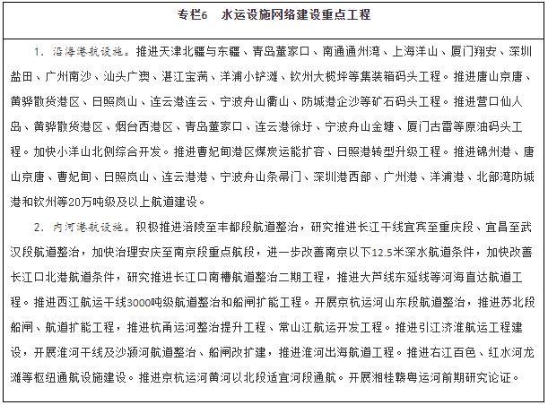 優(yōu)化暢通水運(yùn)設(shè)施網(wǎng)絡(luò)。建設(shè)京津冀、長三角、粵港澳大灣區(qū)世界級港口群,支持山東打造世界一流的海洋港口,推進(jìn)東北地區(qū)沿海港口一體化發(fā)展,優(yōu)化港口功能布局,推動資源整合和共享共用。有序推進(jìn)沿海港口專業(yè)化碼頭及進(jìn)出港航道等公共設(shè)施建設(shè)。適度超前建設(shè)糧食、能源、礦產(chǎn)資源的接卸、儲存、中轉(zhuǎn)設(shè)施,推進(jìn)沿海沿江液化天然氣碼頭規(guī)劃建設(shè)。提升內(nèi)河港口專業(yè)化、規(guī)?;?,合理集中布局集裝箱、煤炭、鐵礦石、商品汽車等專業(yè)化碼頭。加強(qiáng)內(nèi)河高等級航道擴(kuò)能升級與暢通攻堅建設(shè),完善長江、珠江、京杭運(yùn)河和淮河等水系內(nèi)河高等級航道網(wǎng)絡(luò),進(jìn)一步提升珠三角高等級航道網(wǎng)出海能力,全面加強(qiáng)長三角、珠江—西江高等級航道網(wǎng)未達(dá)標(biāo)段建設(shè)。推動重要支流航道和庫湖區(qū)航道、內(nèi)河旅游航道、便民碼頭建設(shè)。