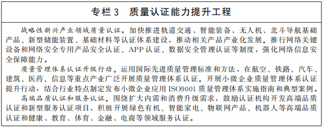 提高質(zhì)量認(rèn)證服務(wù)能力。加快構(gòu)建統(tǒng)一管理、共同實(shí)施、權(quán)威公信、通用互認(rèn)的質(zhì)量認(rèn)證體系,全面提升質(zhì)量認(rèn)證服務(wù)能力,打造一批具有國(guó)際競(jìng)爭(zhēng)力的認(rèn)證品牌。推動(dòng)完善重點(diǎn)產(chǎn)業(yè)質(zhì)量認(rèn)證制度體系,加大網(wǎng)絡(luò)安全認(rèn)證制度推行力度,加快戰(zhàn)略性新興產(chǎn)業(yè)領(lǐng)域質(zhì)量認(rèn)證制度建設(shè),大力推行高端品質(zhì)認(rèn)證和新型服務(wù)認(rèn)證,加快研究和完善國(guó)家數(shù)據(jù)安全標(biāo)準(zhǔn)與認(rèn)證認(rèn)可體系。廣泛開(kāi)展質(zhì)量管理體系認(rèn)證升級(jí)行動(dòng)。健全政府、行業(yè)、社會(huì)等多層面的認(rèn)證采信機(jī)制,推動(dòng)在市場(chǎng)采購(gòu)、行業(yè)管理、行政監(jiān)管、社會(huì)治理等領(lǐng)域廣泛采信認(rèn)證結(jié)果。提升認(rèn)證行業(yè)專(zhuān)業(yè)化集約化水平,優(yōu)化行業(yè)布局結(jié)構(gòu),推動(dòng)認(rèn)證行業(yè)數(shù)字化發(fā)展。
