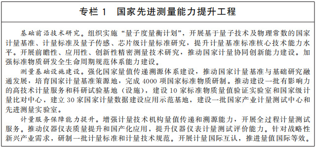 構(gòu)建現(xiàn)代先進(jìn)測(cè)量體系。加強(qiáng)以量子計(jì)量為核心的先進(jìn)測(cè)量體系建設(shè),加快建立新一代國(guó)家計(jì)量基準(zhǔn),推進(jìn)社會(huì)公用計(jì)量標(biāo)準(zhǔn)升級(jí)換代,制定一批關(guān)系國(guó)計(jì)民生的重要計(jì)量技術(shù)規(guī)范。改革完善計(jì)量器具型式批準(zhǔn)、檢定、法制監(jiān)督等管理制度,對(duì)強(qiáng)制管理的計(jì)量器具目錄實(shí)施動(dòng)態(tài)調(diào)整,完善商品量、計(jì)量數(shù)據(jù)等量值監(jiān)管制度。深入推進(jìn)計(jì)量技術(shù)機(jī)構(gòu)改革創(chuàng)新發(fā)展,探索計(jì)量校準(zhǔn)市場(chǎng)和校準(zhǔn)機(jī)構(gòu)建設(shè)的有效途徑,規(guī)范計(jì)量校準(zhǔn)市場(chǎng),滿(mǎn)足市場(chǎng)對(duì)量值溯源和測(cè)試服務(wù)的需求。建立國(guó)家計(jì)量數(shù)據(jù)建設(shè)應(yīng)用示范基地,提升國(guó)家產(chǎn)業(yè)計(jì)量測(cè)試和能源計(jì)量能力。積極參與國(guó)際計(jì)量比對(duì),提升國(guó)際承認(rèn)的校準(zhǔn)與測(cè)量能力。