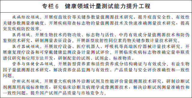 (十五)服務大眾健康與安全。加快醫(yī)療健康領域計量服務體系建設,圍繞疾病防控、生物醫(yī)藥、診斷試劑、高端醫(yī)療器械、康復理療設備、可穿戴設備、營養(yǎng)與保健食品等開展關鍵計量測試技術研究和應用。加強體育設施和器材計量技術研究和測試服務,促進體育產業(yè)高質量發(fā)展。完善地質和海洋災害、地震、洪澇干旱、森林草原火災等自然災害防御的計量保障體系,提高防災、減災、救災計量能力。加強危險化學品、礦山、建筑施工、地質勘查等安全生產相關計量器具的研制生產和監(jiān)督管理。加強公共安全領域計量服務體系建設,開展交通安全、社會穩(wěn)定和安全等領域關鍵計量測試技術研究和應用,推進交通監(jiān)管設備、警用裝備、刑事技術產品等計量測試基礎設施建設。