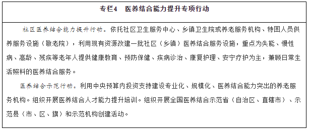 增加醫(yī)養(yǎng)結合服務供給。實施社區(qū)醫(yī)養(yǎng)結合能力提升行動。積極開展基本公共衛(wèi)生服務老年健康與醫(yī)養(yǎng)結合服務項目。支持優(yōu)撫醫(yī)院、光榮院轉型,開展醫(yī)養(yǎng)結合服務。推動社區(qū)衛(wèi)生服務中心與社區(qū)養(yǎng)老服務機構、鄉(xiāng)鎮(zhèn)衛(wèi)生院與特困人員供養(yǎng)服務設施(敬老院)、村衛(wèi)生室與農村幸福院毗鄰建設,采取多種有效方式實現(xiàn)資源整合、服務銜接。