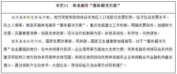 各?。ㄗ灾螀^(qū)、直轄市)要根據(jù)人口老齡化發(fā)展形勢,制定實施專項規(guī)劃,加強與相關規(guī)劃銜接。各級老齡工作委員會要發(fā)揮統(tǒng)籌協(xié)調作用,推動老齡工作委員會各成員單位履職盡責,形成工作合力。發(fā)揮養(yǎng)老服務聯(lián)席會議制度作用,推進養(yǎng)老服務體系建設,強化區(qū)域養(yǎng)老服務資源統(tǒng)籌管理。支持城市群、都市圈打造養(yǎng)老服務體系一體化建設格局,形成服務能力銜接、產業(yè)發(fā)展協(xié)同的合作區(qū)域。支持大型城市和區(qū)域中心城市推動養(yǎng)老產業(yè)集聚發(fā)展,充分發(fā)揮輻射帶動和示范作用。推動以地級行政區(qū)為單位制定“整體解決方案”,將老齡事業(yè)發(fā)展和養(yǎng)老服務體系建設納入經濟社會發(fā)展全局中通盤考慮,全方位整合資源力量,充分調動各方積極性,推動兜底性、普惠型、多樣化三種路徑協(xié)同發(fā)展。